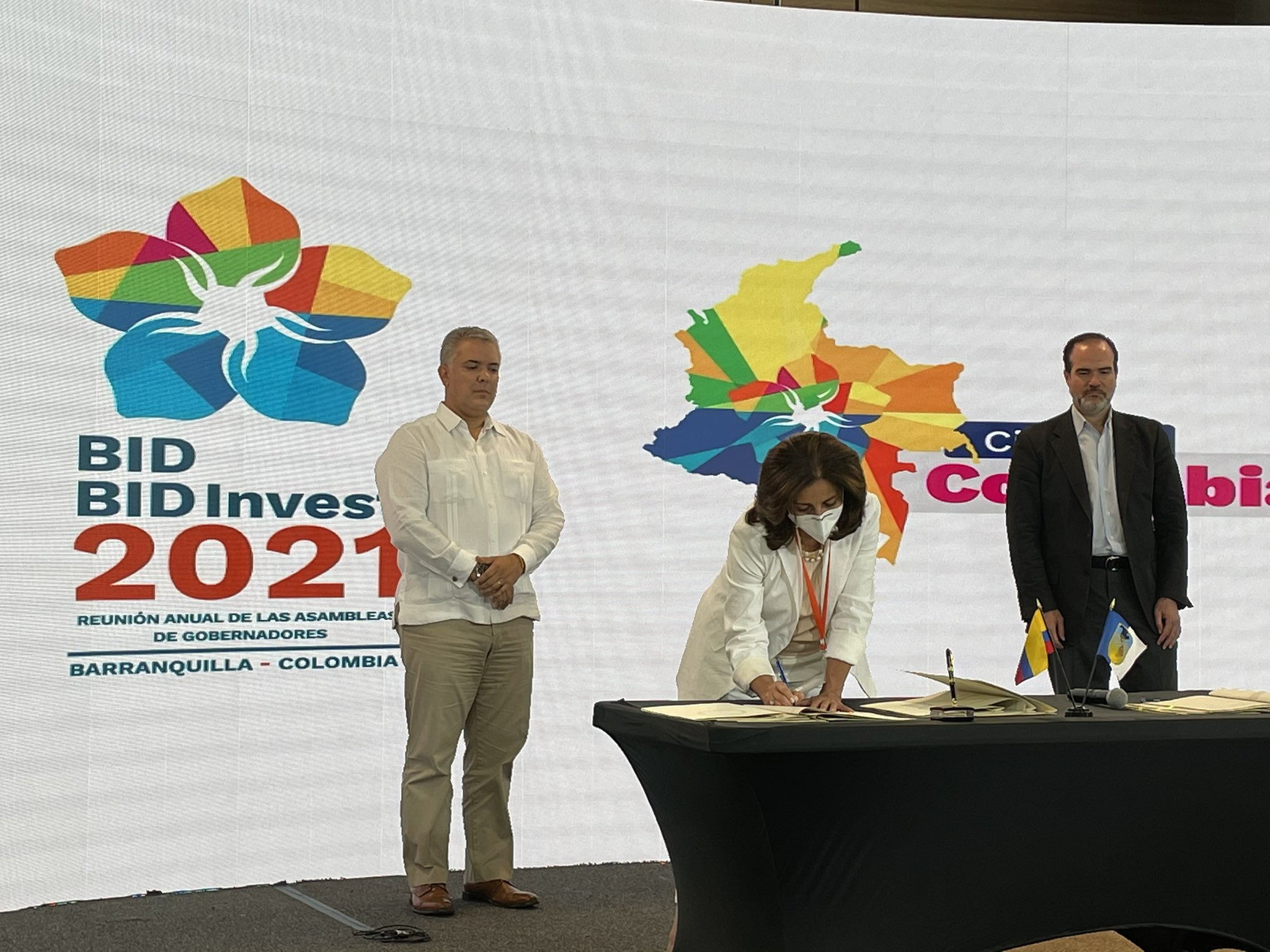El préstamo y los dos convenios de financiación no reembolsable otorgados a Colombia fueron firmados por el presidente del BID, el ministro de Hacienda, Alberto Carrasquilla, y el ministro de Salud, Fernando Ruiz.